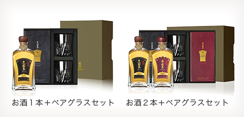 お酒1~2本と、霧島酒造オンラインショップオリジナルのペアグラスセットです。