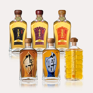 個性の異なる本格焼酎を樽でゆっくり貯蔵することで、樽の風味が焼酎へ溶け込み、口当たりはとろけるようになめらかで液色は琥珀色の輝きを放ちます。樽貯蔵により、味わいが溶け合うそのさまから「とろける・溶け込む」の意を込めて「MELT」と名付けました。